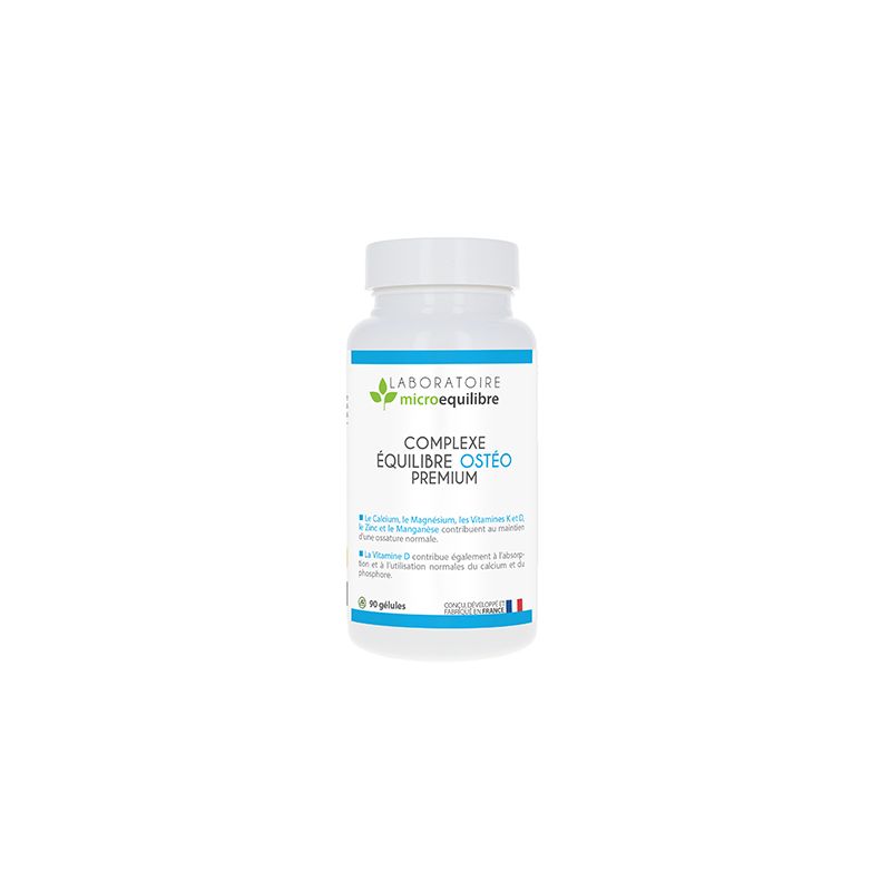 OSTÉO PREMIUM BALANCE COMPLEX is composed of Calcium citrate, Magnesium bisglycinate, Zinc, Manganese, Vitamin K2-MK7 and Vitamin D3.