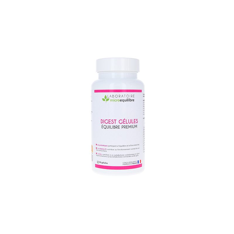 COMPLEXE EQUILIBRE DIGEST GELULES PREMIUM consists of L-glutamine and 8 bacterial strains (lactobacilli and bifidobacteria) naturally present in the human intestine, for a total of 10 billion bacteria. Zinc and vitamin B6 are involved in cell synthesis and renewal. -