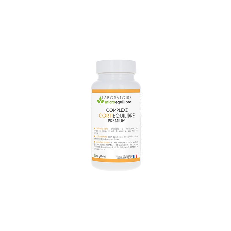 CORTIEQUILIBRE PREMIUM COMPLEX is made up of magnesium bisglycinate, gaba, ashwagandha, schisandra, eleutherococcus, lemon balm, rhodiola, vitamin B6 and chromium, to improve the body's resistance to stress and help the body cope with stress to support mental and physical capacities in cases of weakness, exhaustion and fatigue, and during convalescence. -