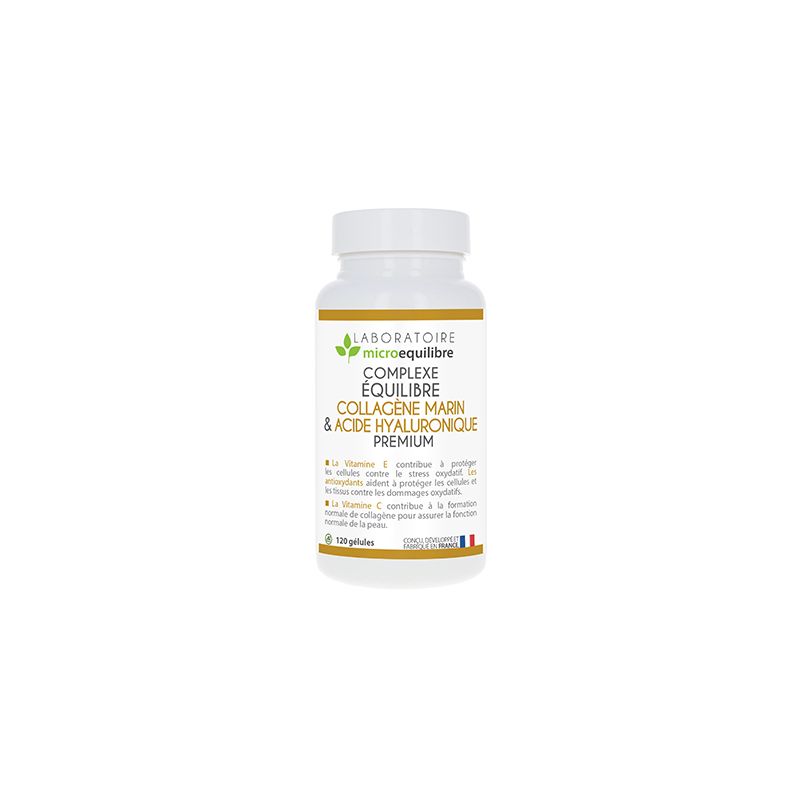 ÉQUILIBRE COLLAGÈNE MARIN NatiCol® & ACIDE HYALURONIQUE a la particularité d'associer le collagène marin NatiCol® à l'acide hyaluronique. Le collagène marin NatiCol® est une forme extrêmement pure de collagène, extrait du poisson et dont l’action a été démontrée par de nombreuses études cliniques. Le collagène marin Naticol® contient également en quantités massives 8 différents acides aminés avec un poids moléculaire très bas favorisant sa biodisponibilité. Il renferme d'autres actifs comme les vitamines C et E et de l'extrait de pépins de raisin. La vitamine E et la vitamine C permettent de protéger les cellules contre les dommages oxydatifs. La vitamine C optimise la formation de collagène pour assurer la bonne fonction de la peau, des os et des cartilages.