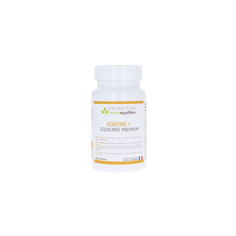ÉQUILIBRE KERATINE+ apporte de la kératine (500 mg / 2 gelules) associée au sélénium, la riboflavine, la silice ainsi que la biotine et le zinc.